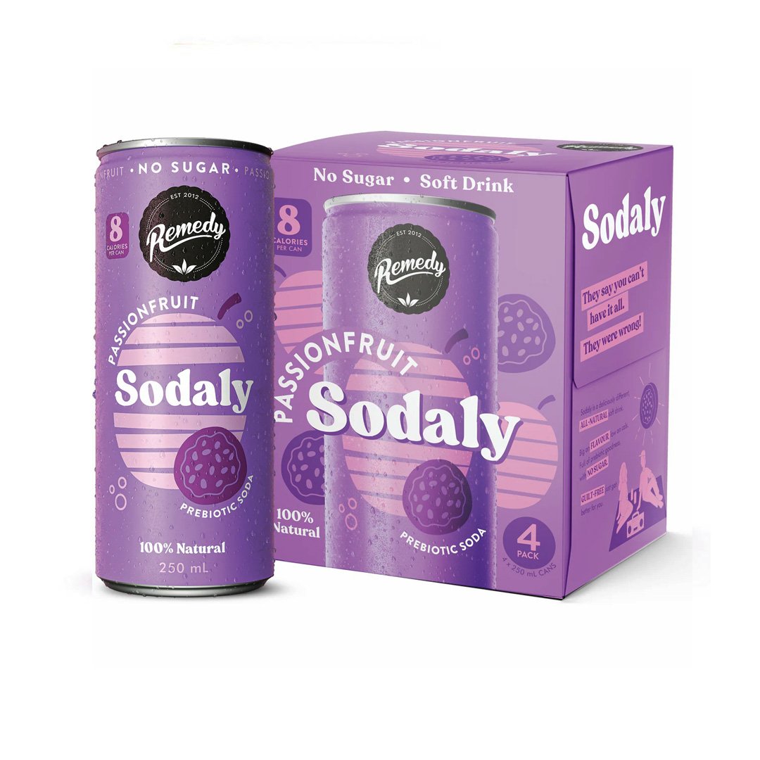 Sodaly Passionfruit– is a great tasting, all-natural prebiotic soft drink that’s big on flavour and low on guilt! Each 250ml can contains no sugar, all natural fruit flavours, a boost of ACV prebiotic goodness and only 8 calories. With a base of gut-loving ACV, all-natural fruit flavour and a burst of fizz, there’s nothing artificial here! Probiotics are live bacteria found in certain foods and drinks like kombucha, kefir and sauerkraut. Prebiotics feed the healthy gut bacteria and promote a robust and healthy microbiome, like ACV, banana, oats and garlic. Eating balanced amounts of both probiotics and prebiotics can help ensure that you have the right balance of these bacteria to keep your gut microbiota healthy.